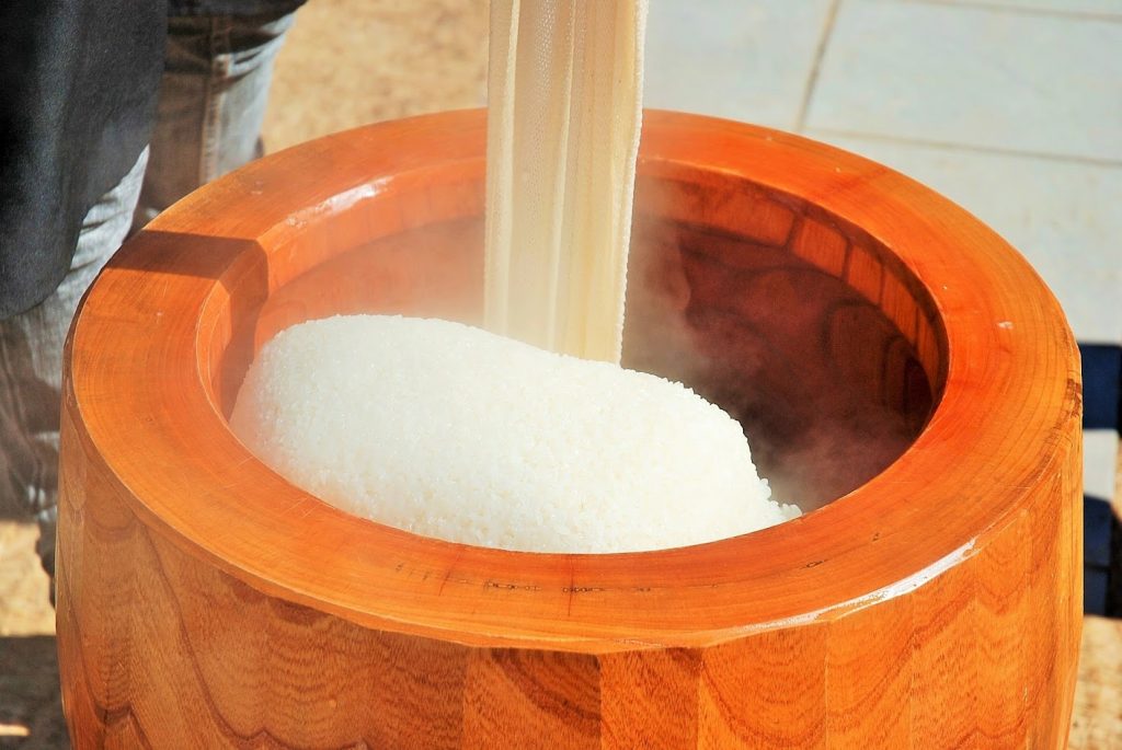 この状態から、お米の潰しを5~10分位おこない、次にぺったんぺっんと、お餅つき。