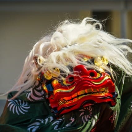 獅子舞はライオン起源の想像上の動物・獅子の頭をかぶり、胴衣を身につけて舞う、